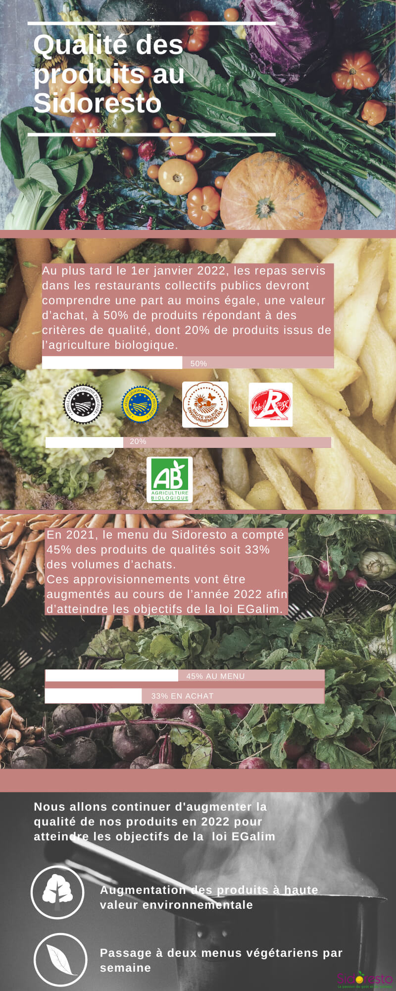 Depuis le 1er janvier 2022, les repas servis dans les restaurants collectifs doivent comprendre une part au moins égale, une valeur d’achat, à 50% de produits répondant à des critères qualité, dont 20% de produits issus de l’agriculture biologique.